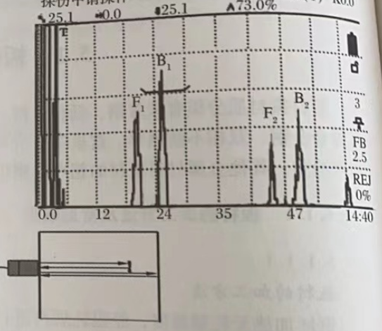 2.當探頭位于缺陷較小區域(缺陷截面小于聲束截面) 時,顯示屏上缺陷反射回波與底面反射回波共存,底面反射回波有所下降,如圖5-1 (b) 所示。