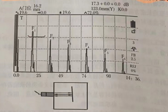 3,當探頭位于缺陷較大區域(缺陷面大于等于聲束面)時,顯示上只有缺陷的多次反射回波,底面反射回波消失,如圖5-1 (c) 所示。