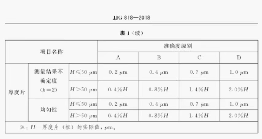 圖片是針對JJG 818-2018標準針對厚度校準片的準確度級別要求,我們公司沈陽宇時先鋒生產的厚度符合該標準中的A級精度,厚度片規格從5um-100000um區間都涉及到,如有需要請來電咨詢15734068833(微信同號)