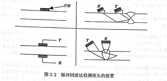 如果接收探頭與發射探頭分開,這樣的布置叫做一發一收檢測,缺陷定位要采用三角法。如果接收探頭沿著聲束傳播軸線并從發射探頭越過工件,這種方法稱為穿透式超聲檢測。圖3.2是脈沖回波法檢測中常用的三種模式