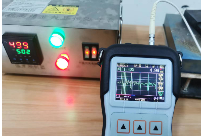 使用高溫延遲線探頭,高溫延遲線的作用是在被測樣件的高溫表面與探頭晶片之間起到保護性緩沖作用。測量時使用界面波回波法,可避免由于探頭溫度變化和零點漂移帶來的測量誤差。