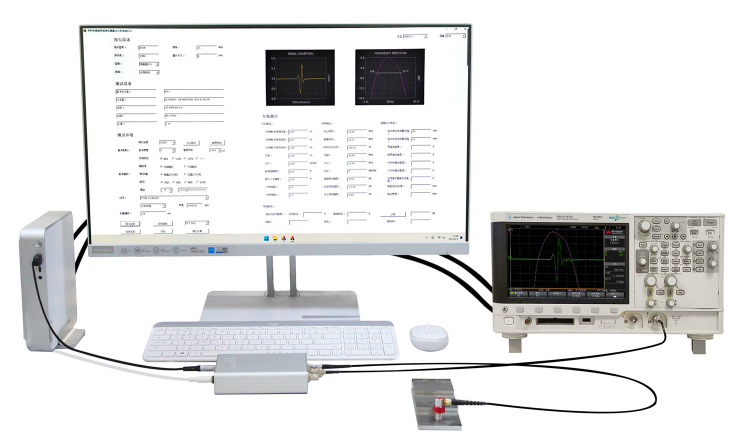 超聲波脈沖發(fā)生/ 接收器、 2通道數(shù)字存儲示波器、高精密掃描定位機構(gòu)及三維運動控制軟件、測量分析軟件(根據(jù)采集到的原始數(shù)據(jù)進行運算分析,得到所需的特征參數(shù)及圖像結(jié)果,結(jié)果包括超聲探頭的峰值頻率、中心頻率和帶寬、-14dB脈沖寬度、-20dB脈沖寬度、聲束參數(shù)、相對脈沖靈敏度等)、標(biāo)準試塊、工控機等。