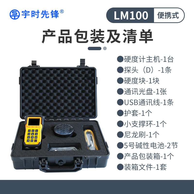 | 標準配置 | LM100主機、D型沖擊裝置、高值標準里氏硬度塊、護套、支撐環、尼龍刷、兩節AA電池、操作手冊、儀器箱 |