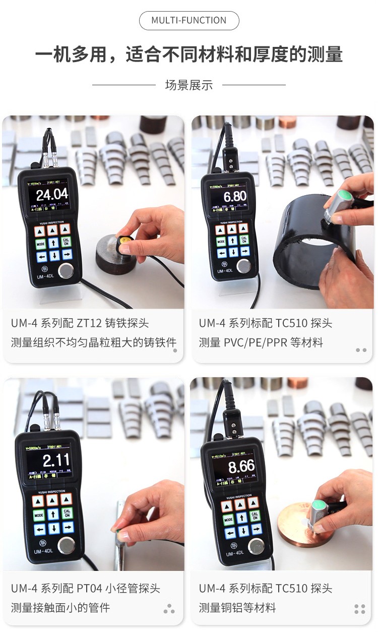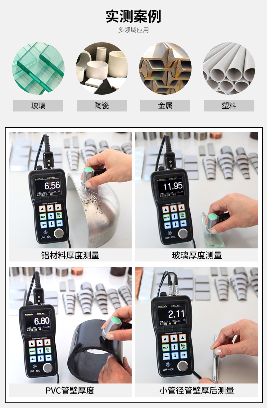 應用范圍:可以測量金屬材質、管道、壓力容器、板材(鋼板、鋁板)、塑料、鐵管、PVC管、玻璃等其他特殊材料的厚度;也可以測量工件表面有油漆層等帶涂層的材料;也應用于制作業、金屬加工業、化工業、商檢業等檢測領域。
