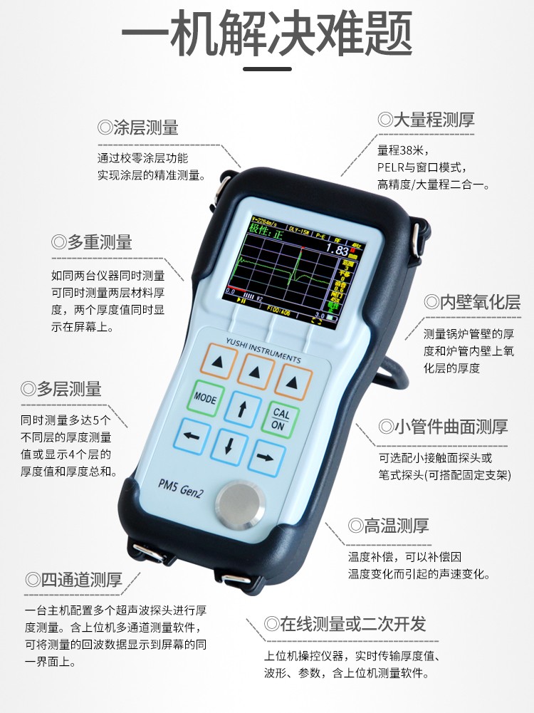 PM5 Gen2測厚儀是宇時先鋒研發創新的一款帶有多種標準測量功能和特殊功能選項的高級超聲波測厚儀。這款便攜式測厚儀使用不同頻率和不同類型的單晶探頭能夠滿足大對數測量需求。而且測量范圍廣,厚度從0.15mm的薄鋼板,到幾十米的長鋼棒,甚至幾十微米的薄漆層,都可以實現測量。功能齊全的PM5 Gen2是一款集多種解決方案于一體的創新型儀器,可用于幾乎所有測厚應用。