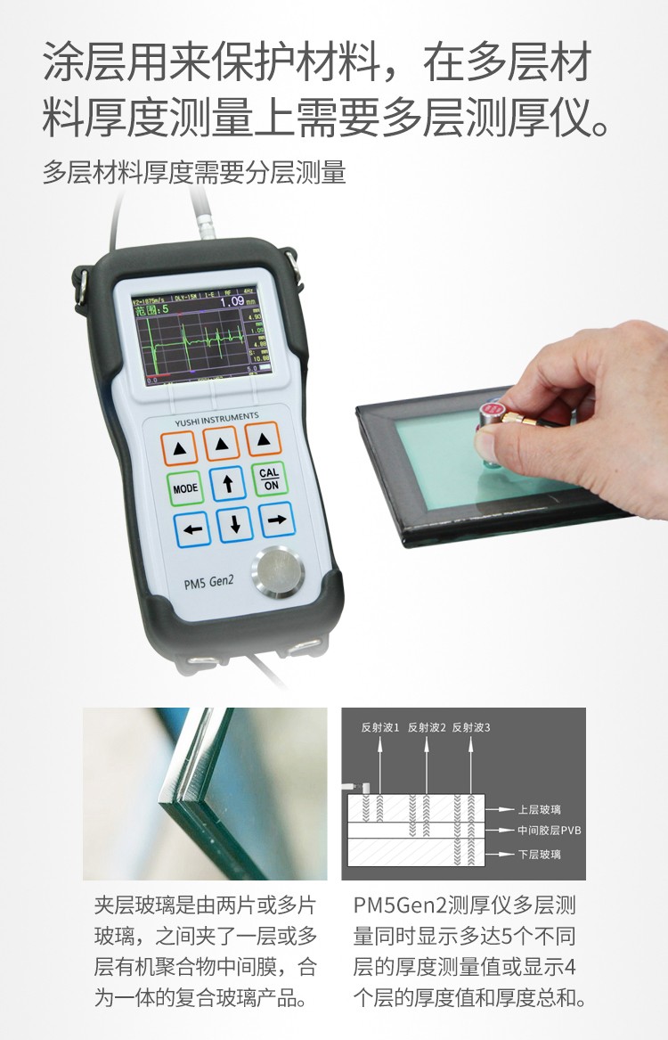 功能強大的多重測量功能,如同兩臺儀器同時測量。可同時測量基材和涂層材料厚度或同時測量復合材料的分層材料厚度,兩個厚度值同時顯示在屏幕上。