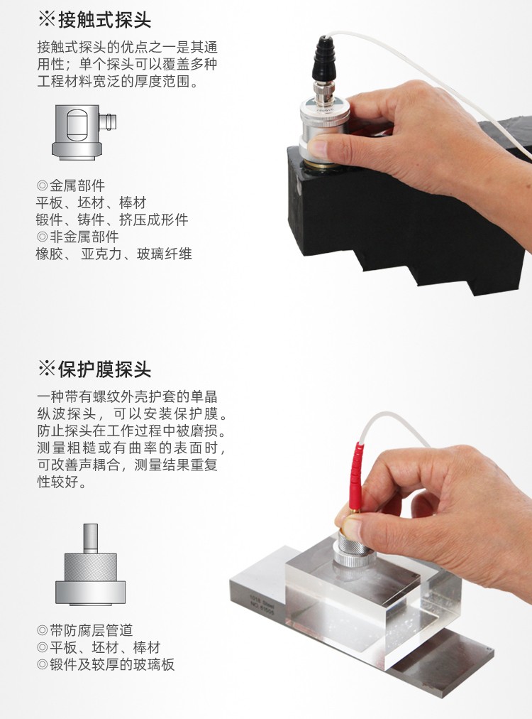 PM5 Gen2測厚使用不同頻率和不同類型的單晶探頭能夠完成大對數測量。探頭頻率范圍在0.5-20MHz。可搭配延遲線探頭、接觸式探頭、保護膜探頭、高溫探頭等。